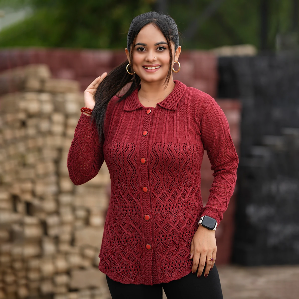 Stay cozy and fashionable this winter with our Elegant Maroon Knit Cardigan, crafted for warmth and sophistication. Made from premium acrylic wool, it features a stylish open-knit pattern, shirt collar, and front button closure with matching maroon buttons. The soft, breathable fabric ensures comfort, while the elegant maroon shade adds a touch of class to your winter outfit. Perfect for both everyday wear and office settings.