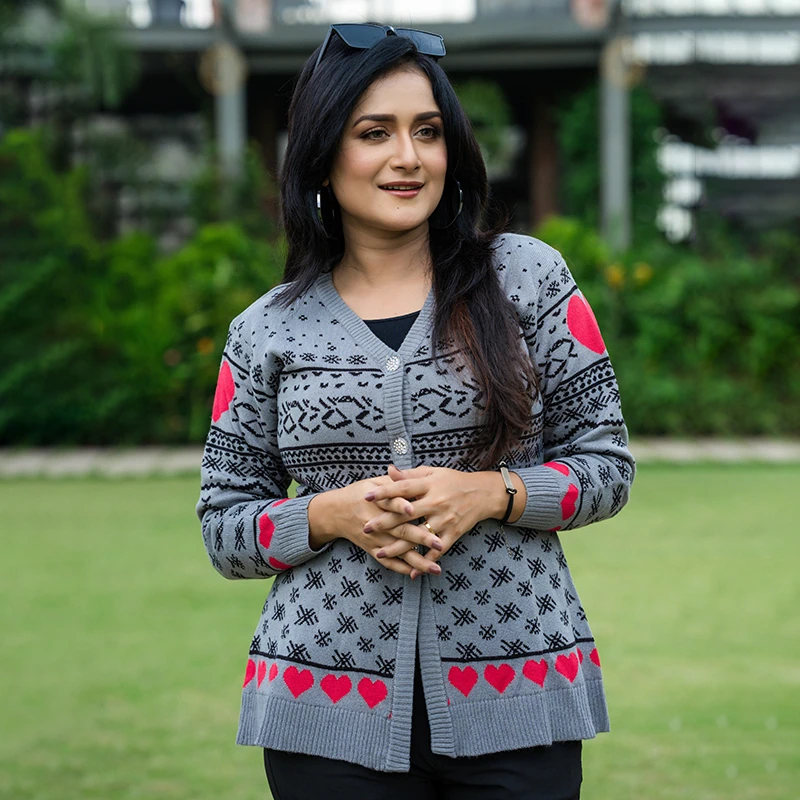 Stay warm and stylish this season with the Grey Love Winter Cardigan, a perfect mix of comfort and modern design. Crafted with soft acrylic wool, it features elegant Nordic-inspired snowflake patterns and charming red heart details that add a touch of warmth to your look.